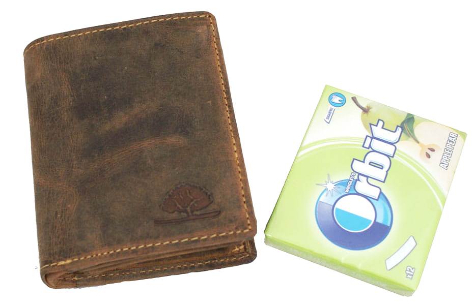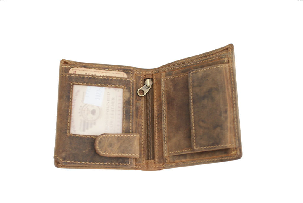 Portfel mini dwuczęściowy; przestrzeń na karty i banknoty zamykana patka na zatrzask oraz komora na monety zamykana klapką na zatrzask, uszyty z wysokiej jakości skóry naturalnej, obrabianej ręcznie , naturalnymi garbnikami, co nadaje jej niepowtarzalny wygląd i fakturę w odcieniu klasycznego „postarzanego” brązu.