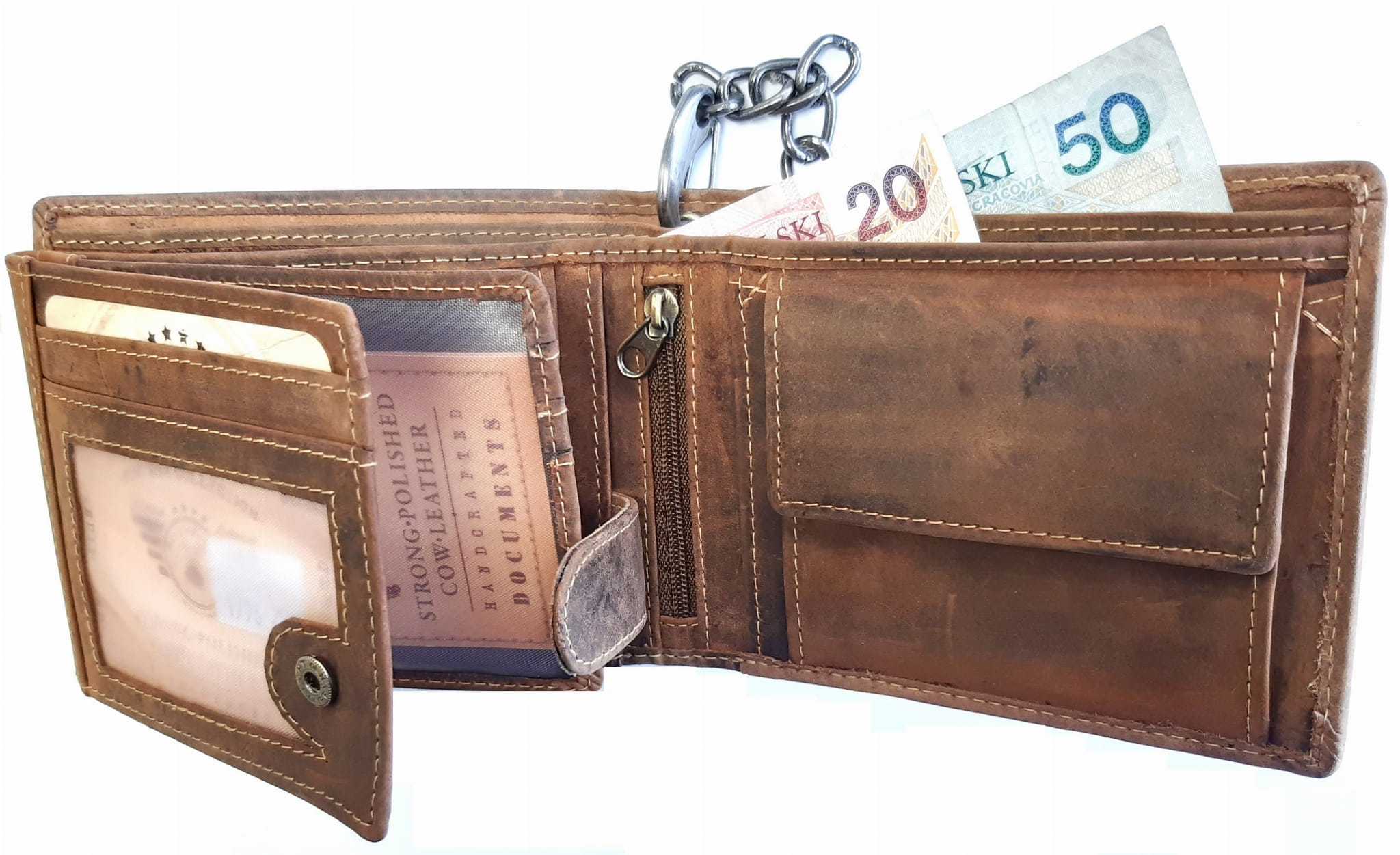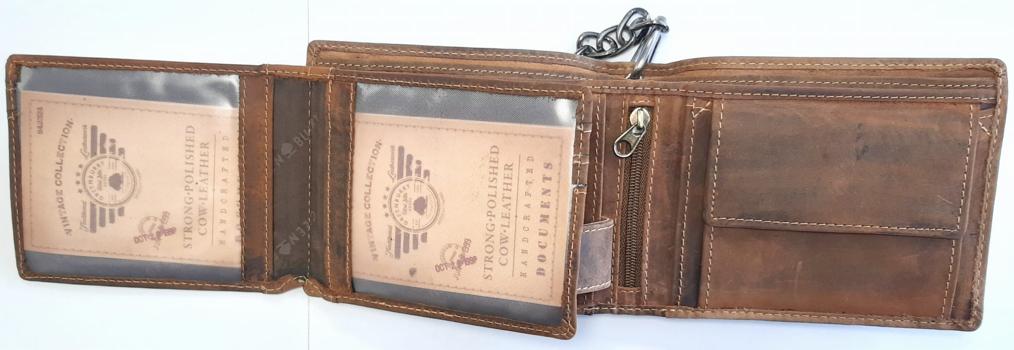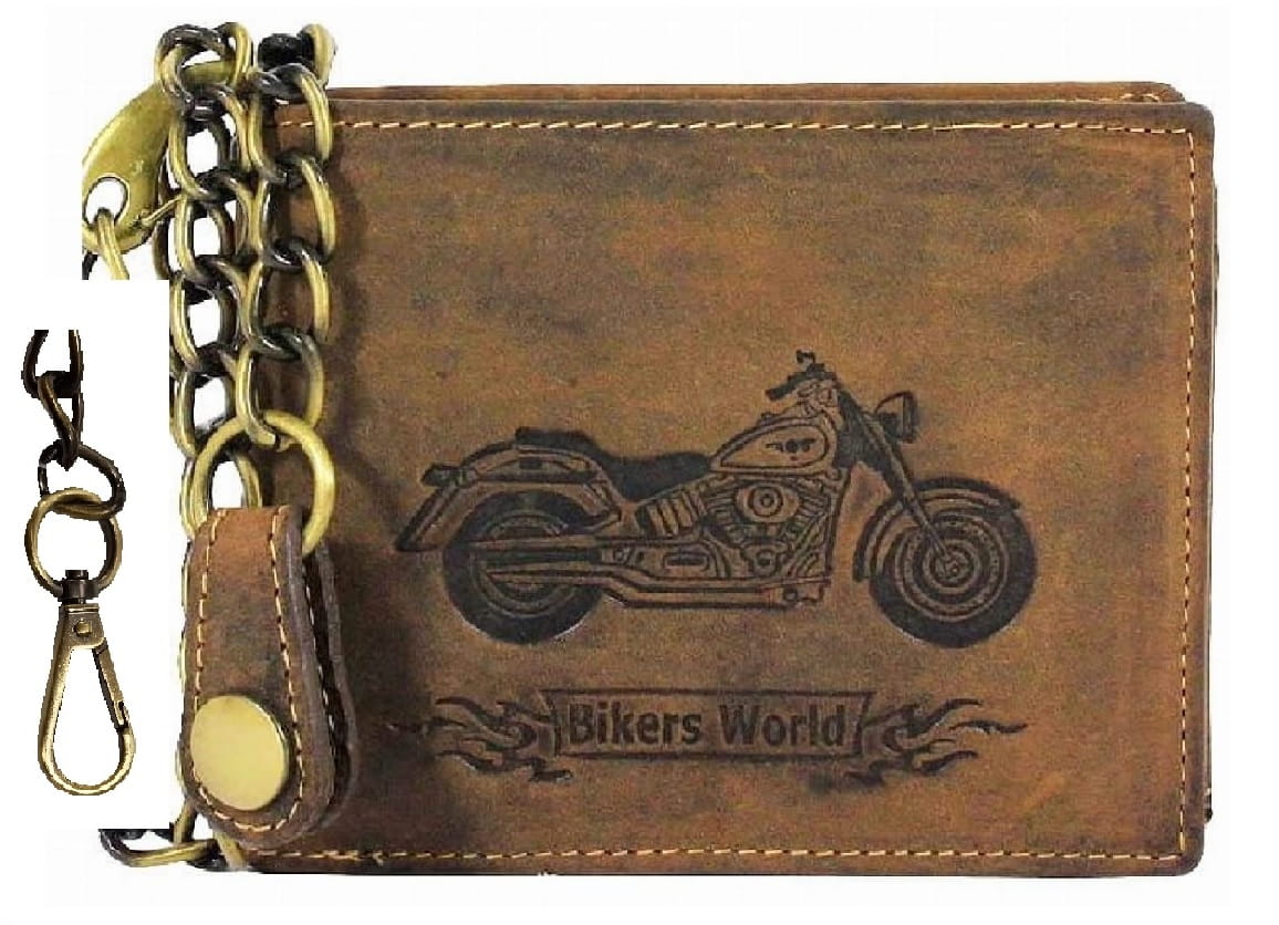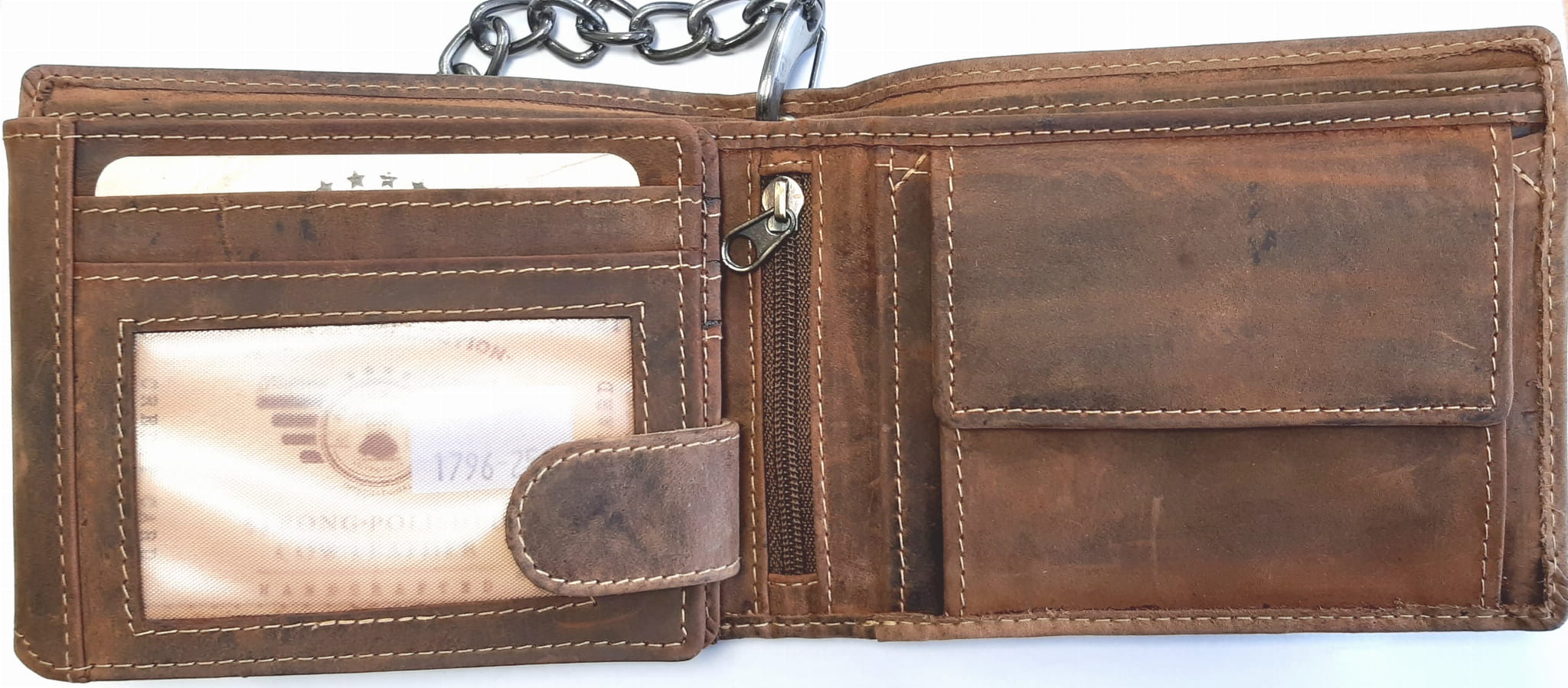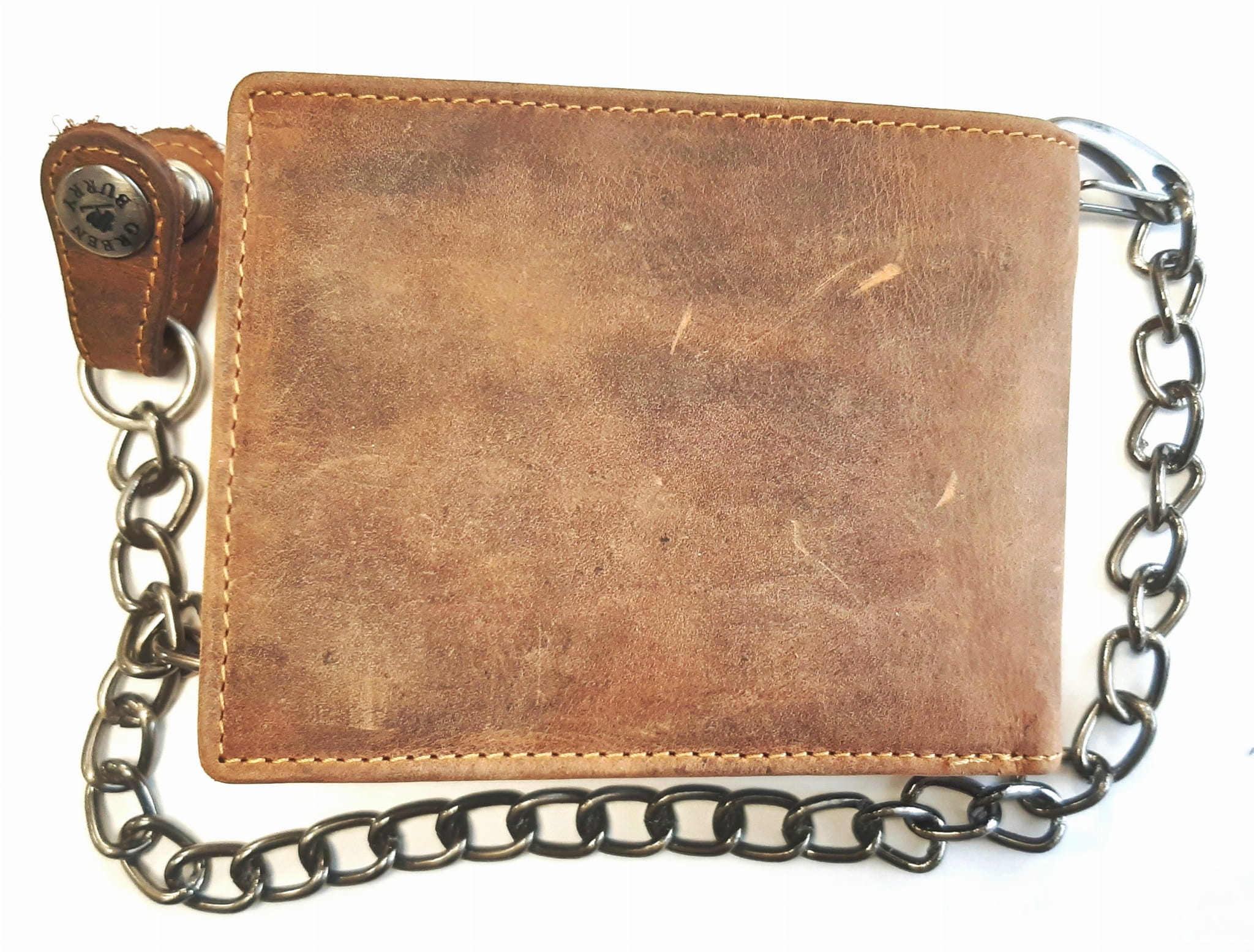 Portfel w układzie poziomym, z tłoczonym wizerunkiem motocykla i odpinanym łańcuszkiem do mocowania; uszyty z wysokiej jakości skóry naturalnej, obrabianej ręcznie , naturalnymi garbnikami, co nadaje jej niepowtarzalny wygląd i fakturę w odcieniu klasycznego „postarzanego” brązu.
