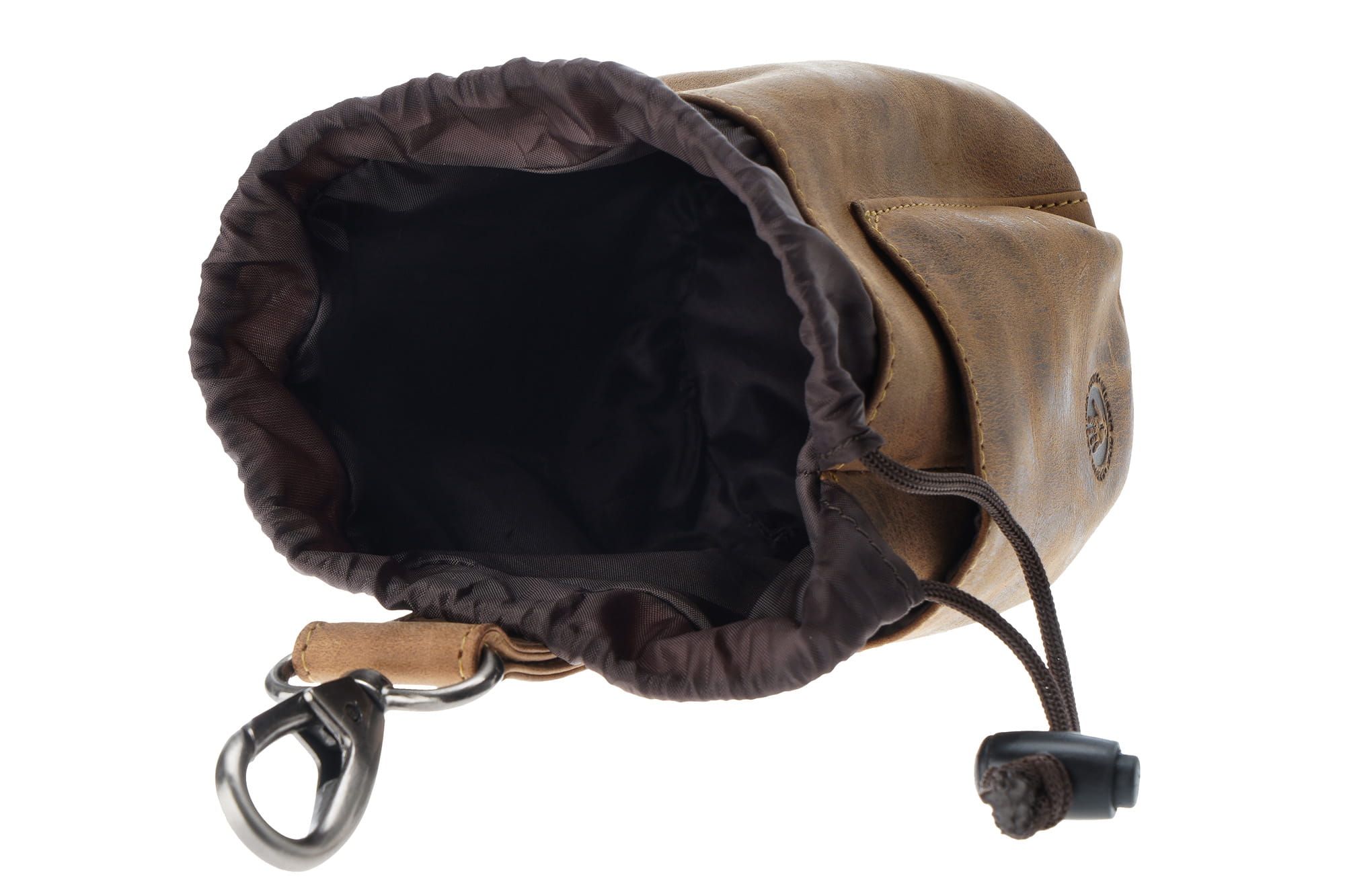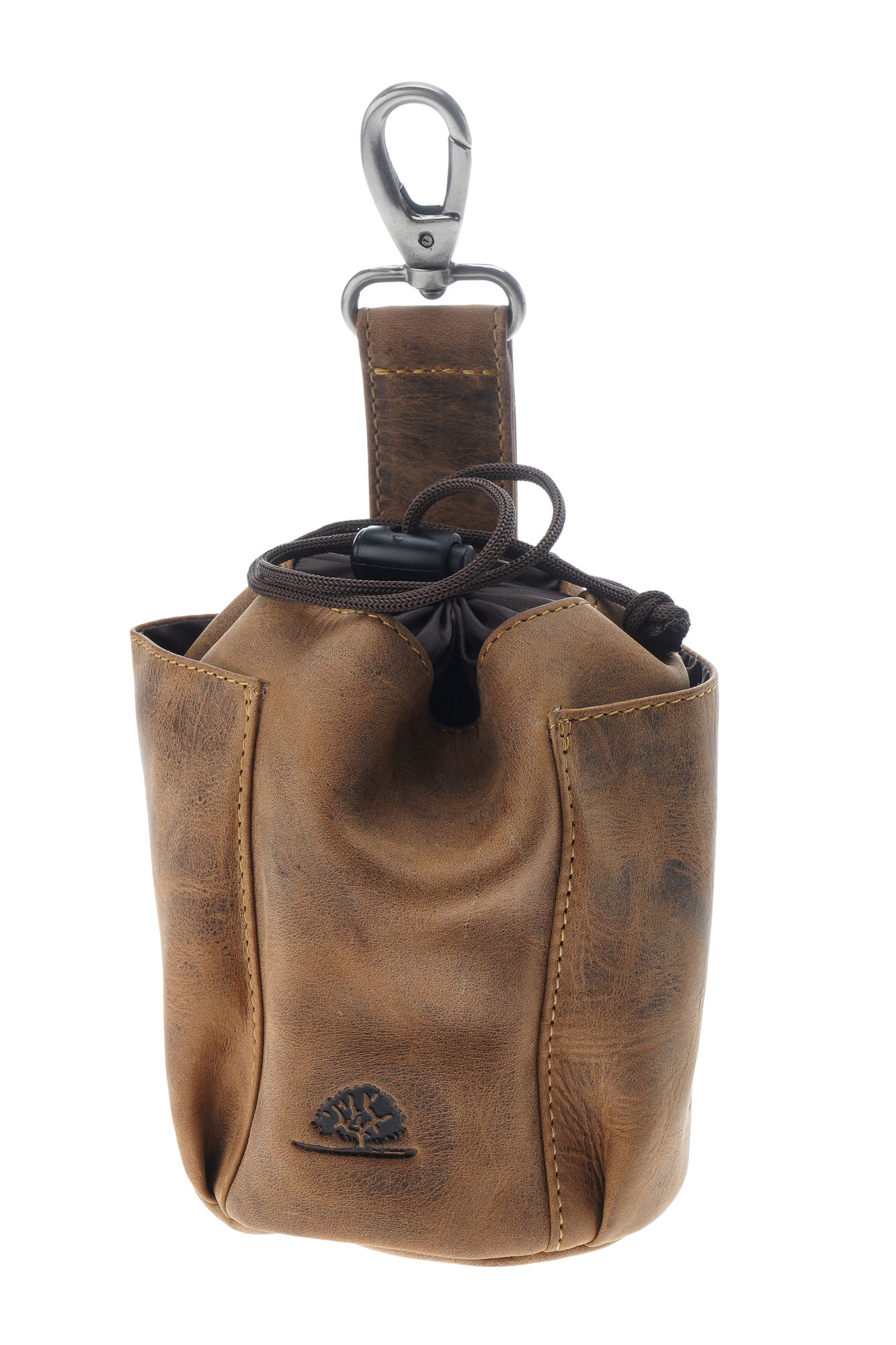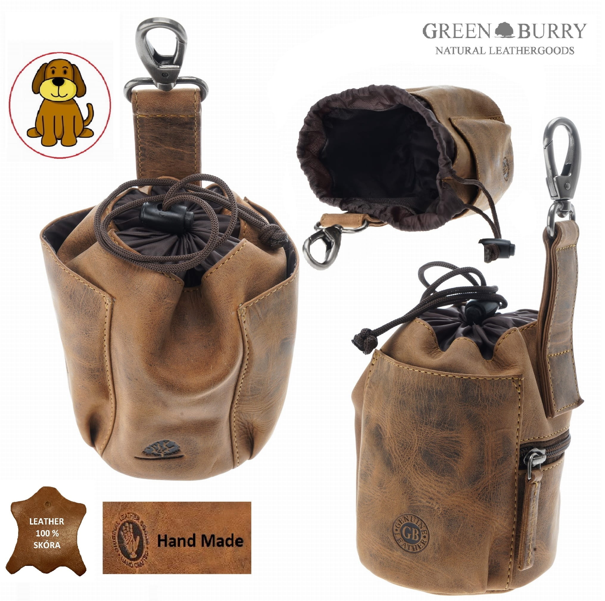 Saszetka na przysmaki dla psa, w formie woreczka z możliwością mocowania do paska, uszyta z wysokiej jakości skóry naturalnej, obrabianej ręcznie , naturalnymi garbnikami, co nadaje jej niepowtarzalny wygląd i fakturę w odcieniu klasycznego „postarzanego” brązu.