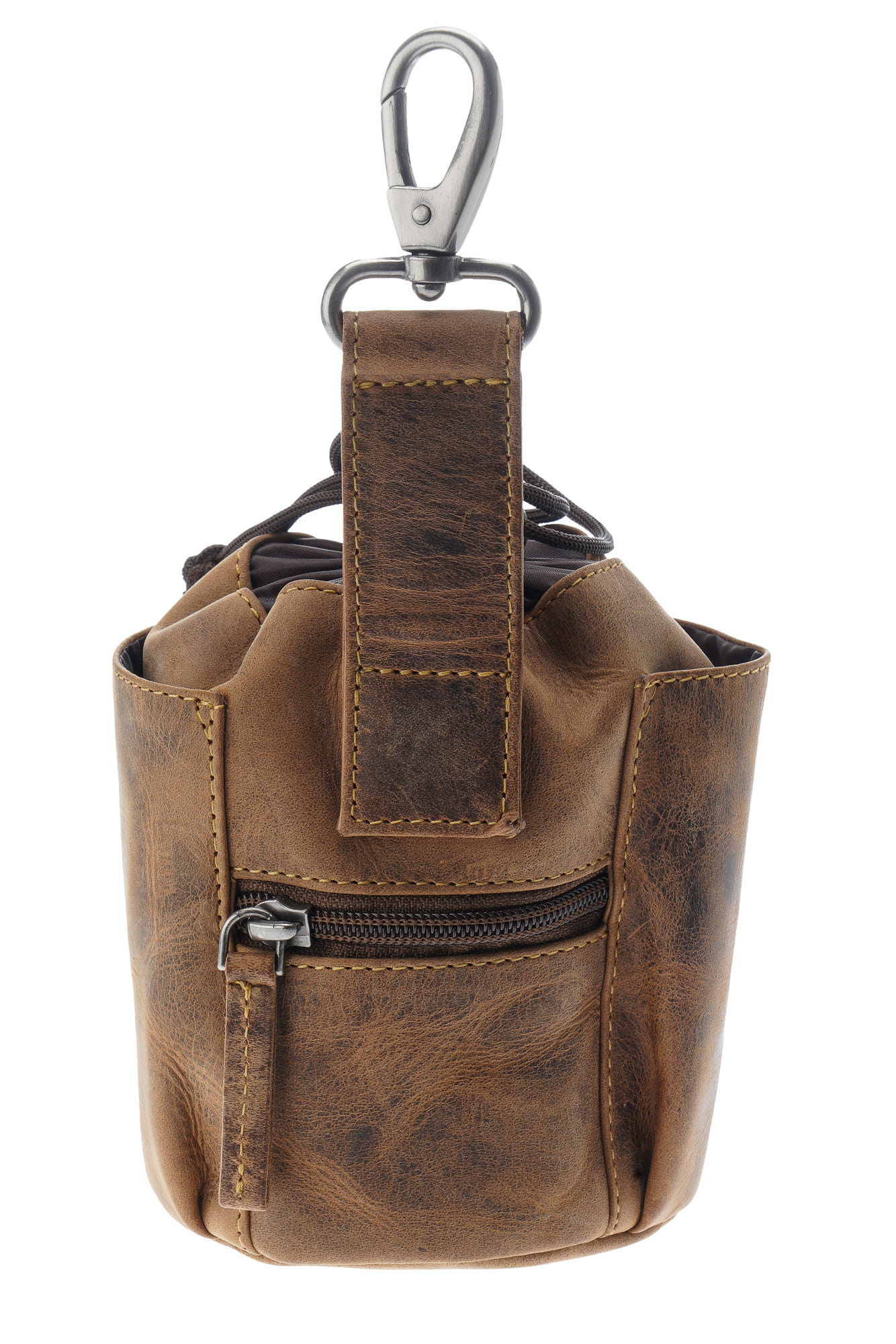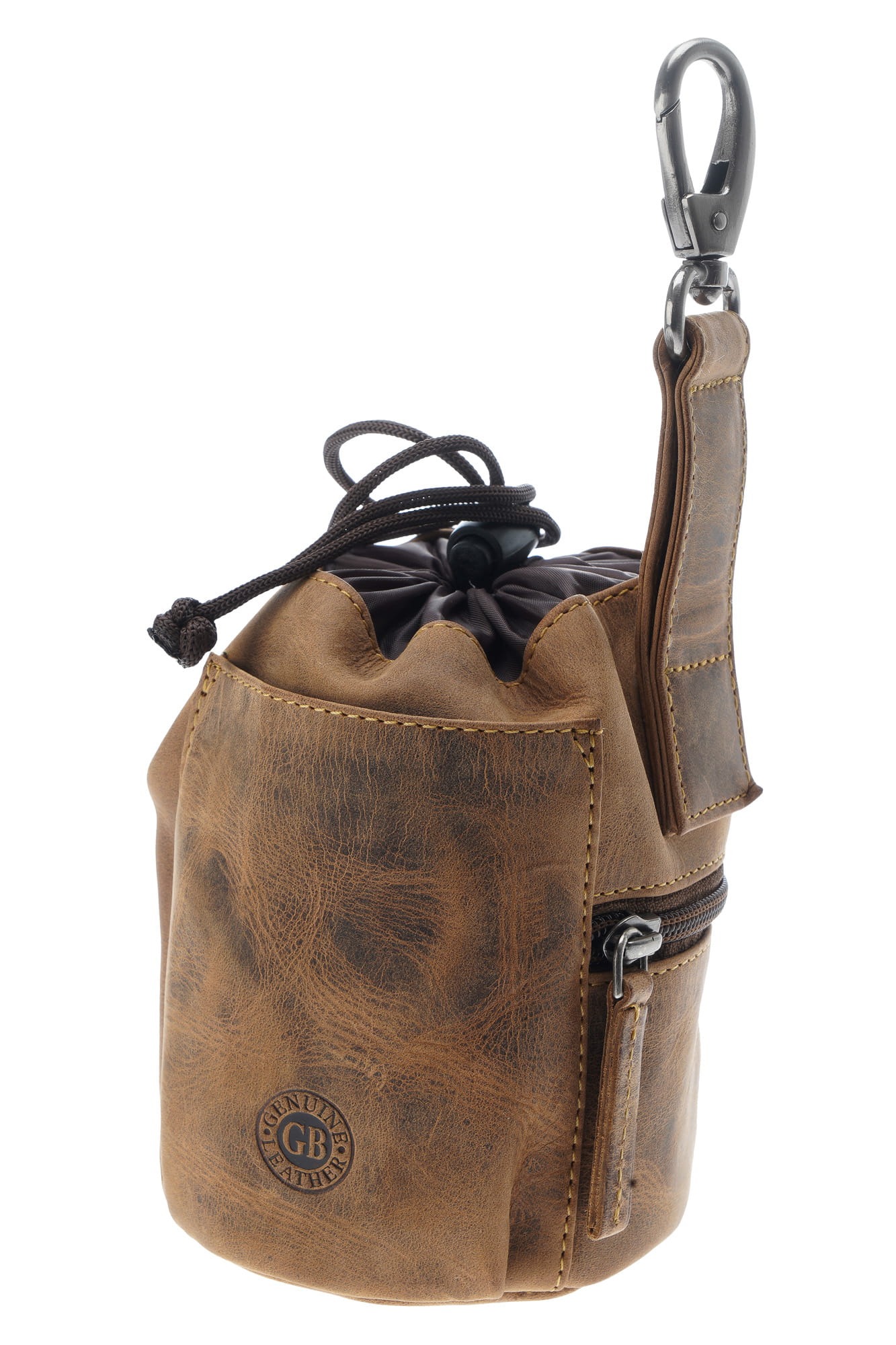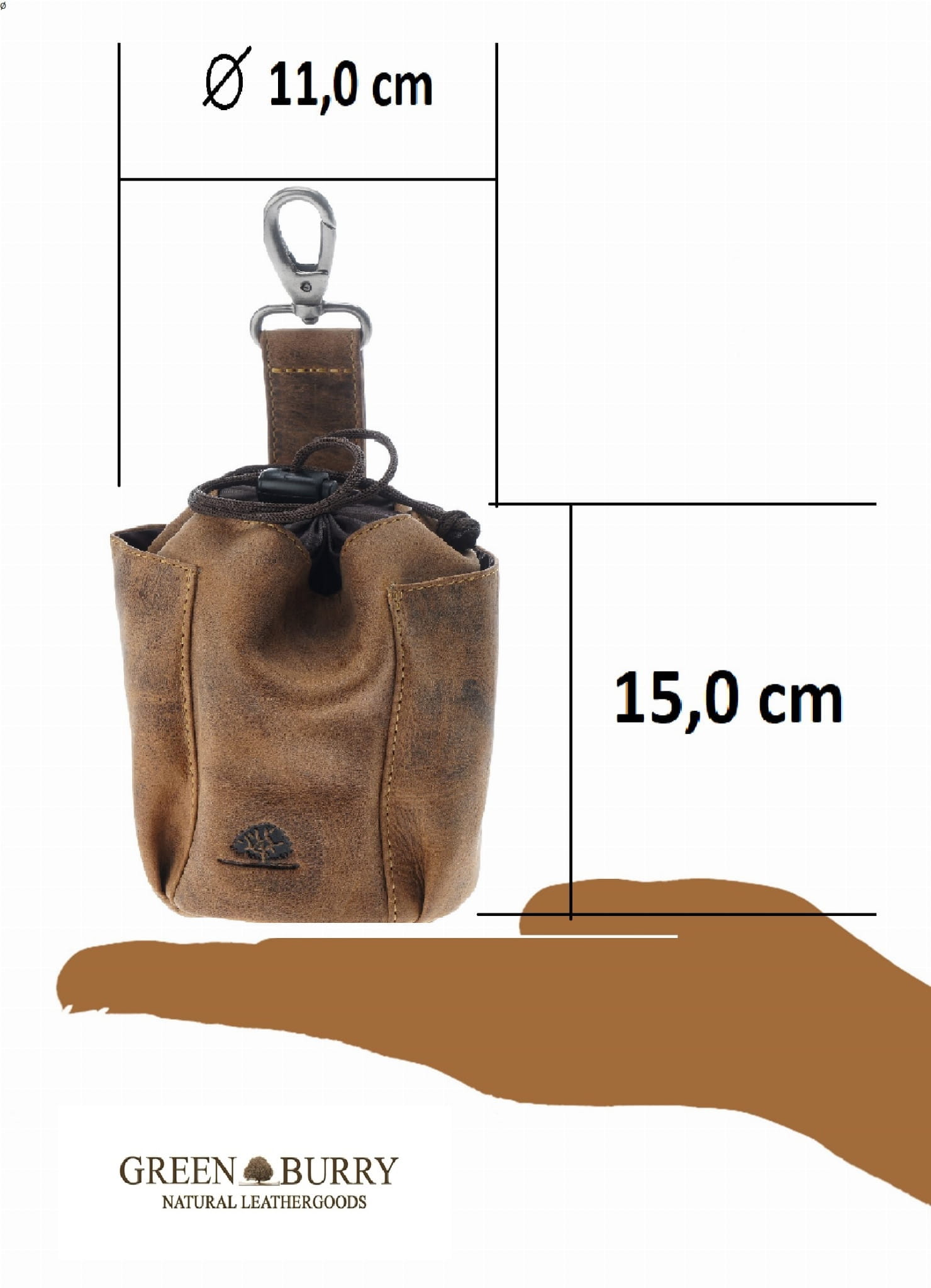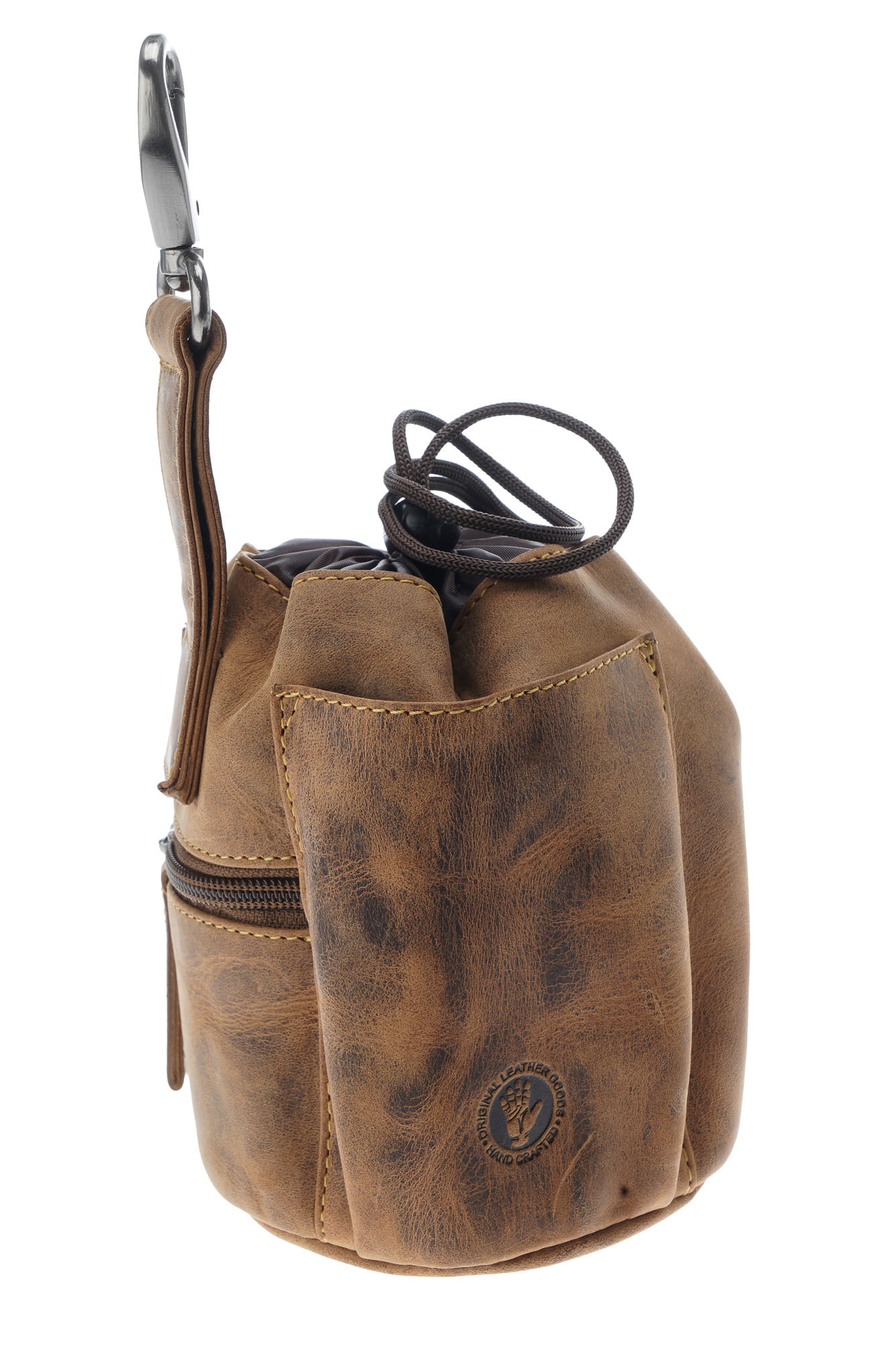 Saszetka na przysmaki dla psa, w formie woreczka z możliwością mocowania do paska, uszyta z wysokiej jakości skóry naturalnej, obrabianej ręcznie , naturalnymi garbnikami, co nadaje jej niepowtarzalny wygląd i fakturę w odcieniu klasycznego „postarzanego” brązu.