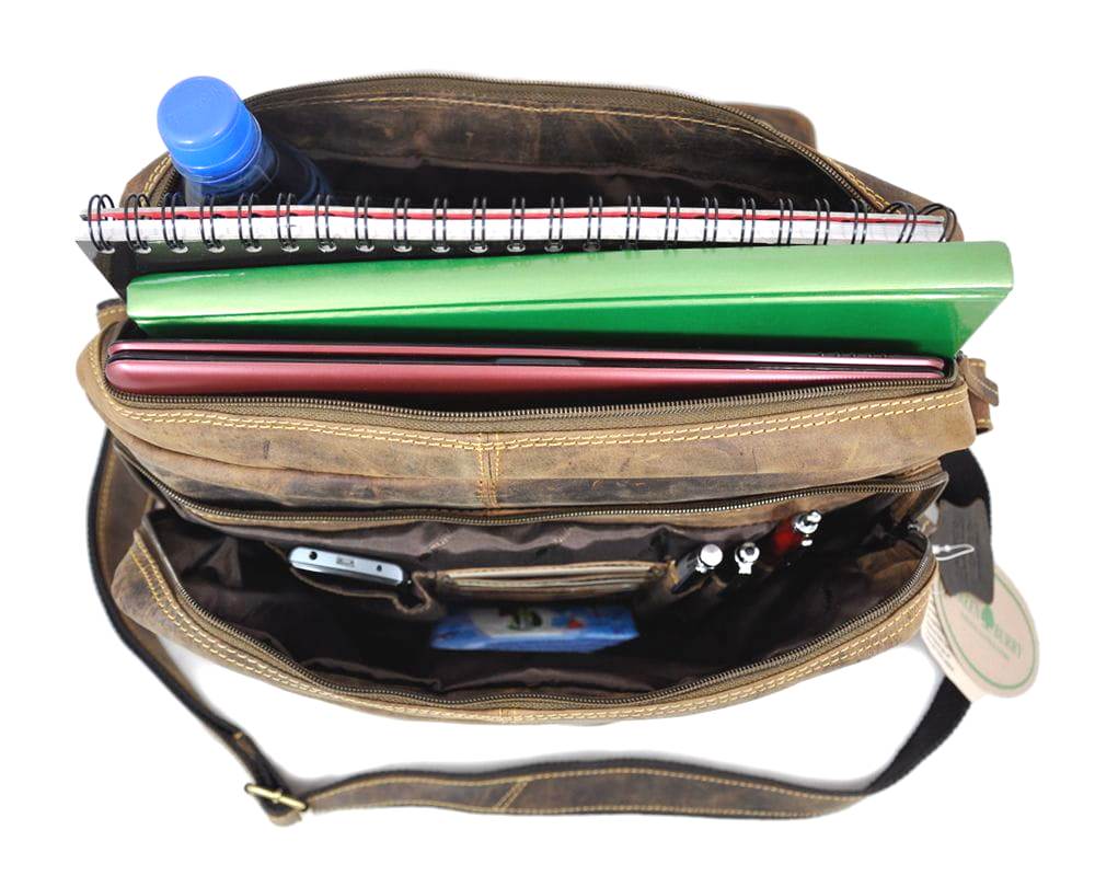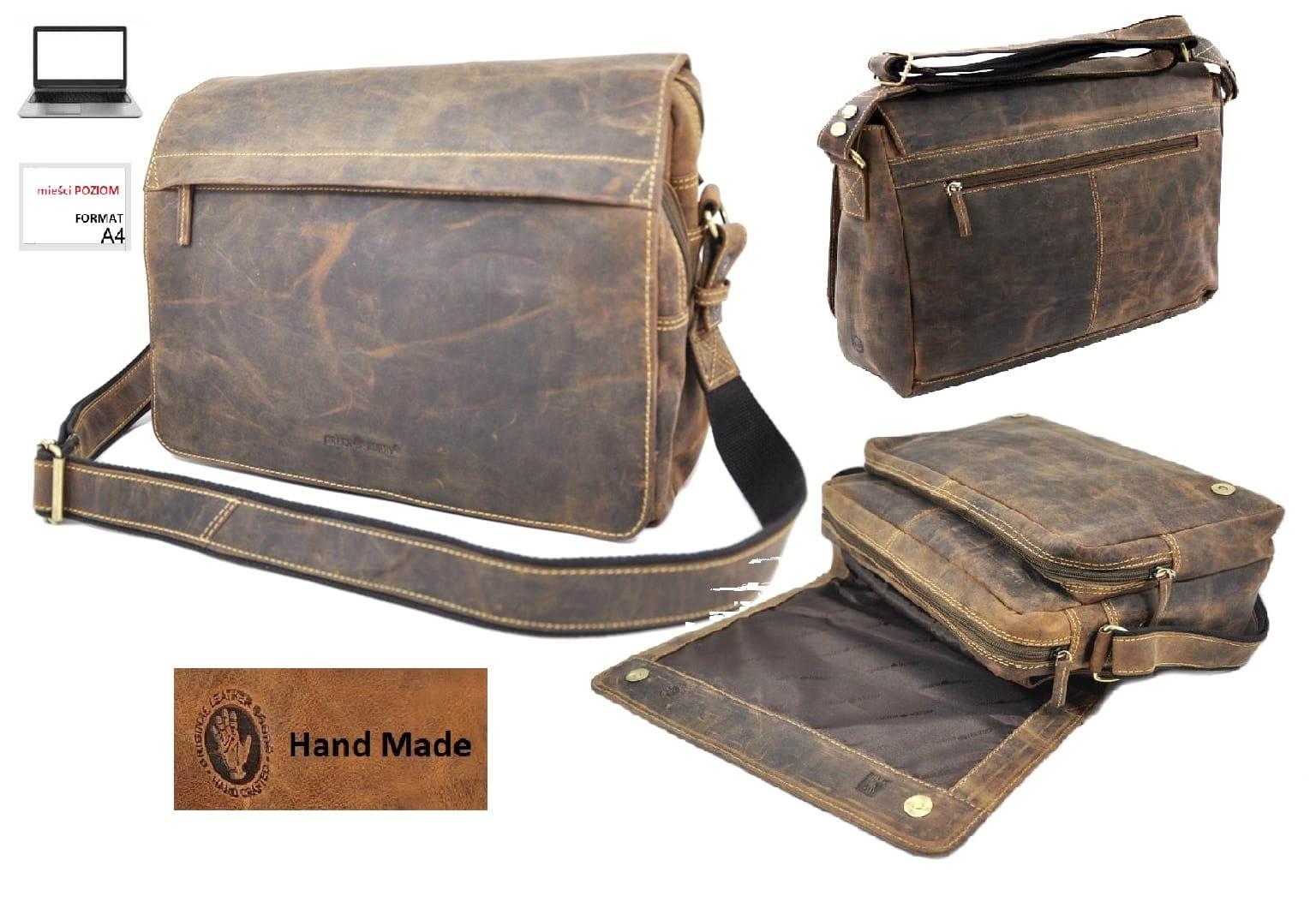 Torba na ramię zamykana klapą z dwoma zamkami magnetycznymi, mieści format A5 (laptop) uszyta z wysokiej jakości skóry naturalnej, obrabianej ręcznie , naturalnymi garbnikami, co nadaje jej niepowtarzalny wygląd i fakturę w odcieniu klasycznego „postarzanego” brązu.