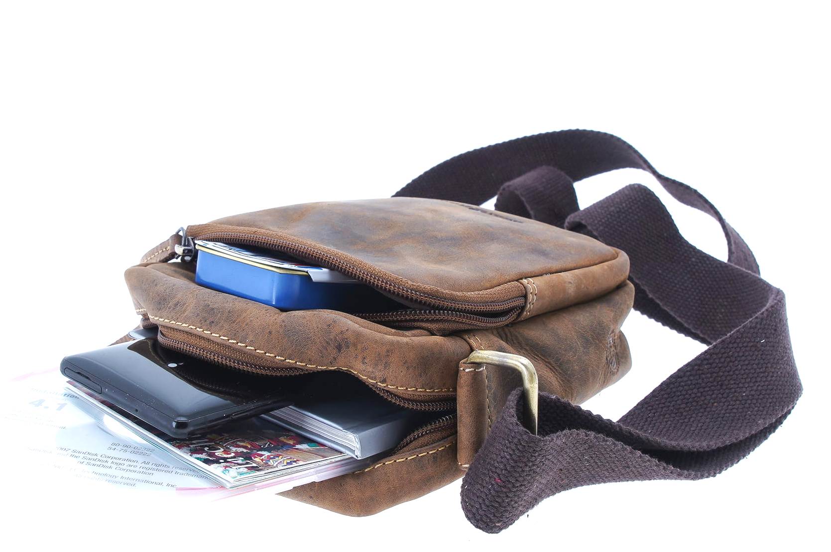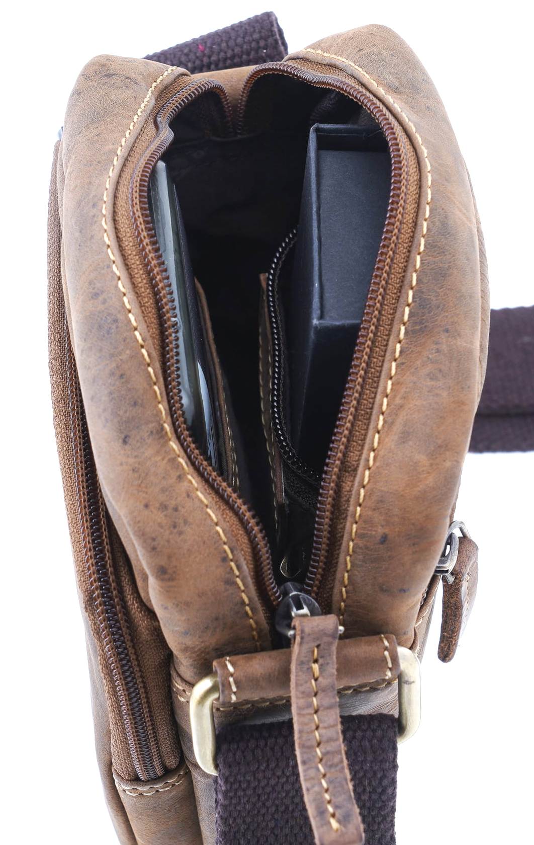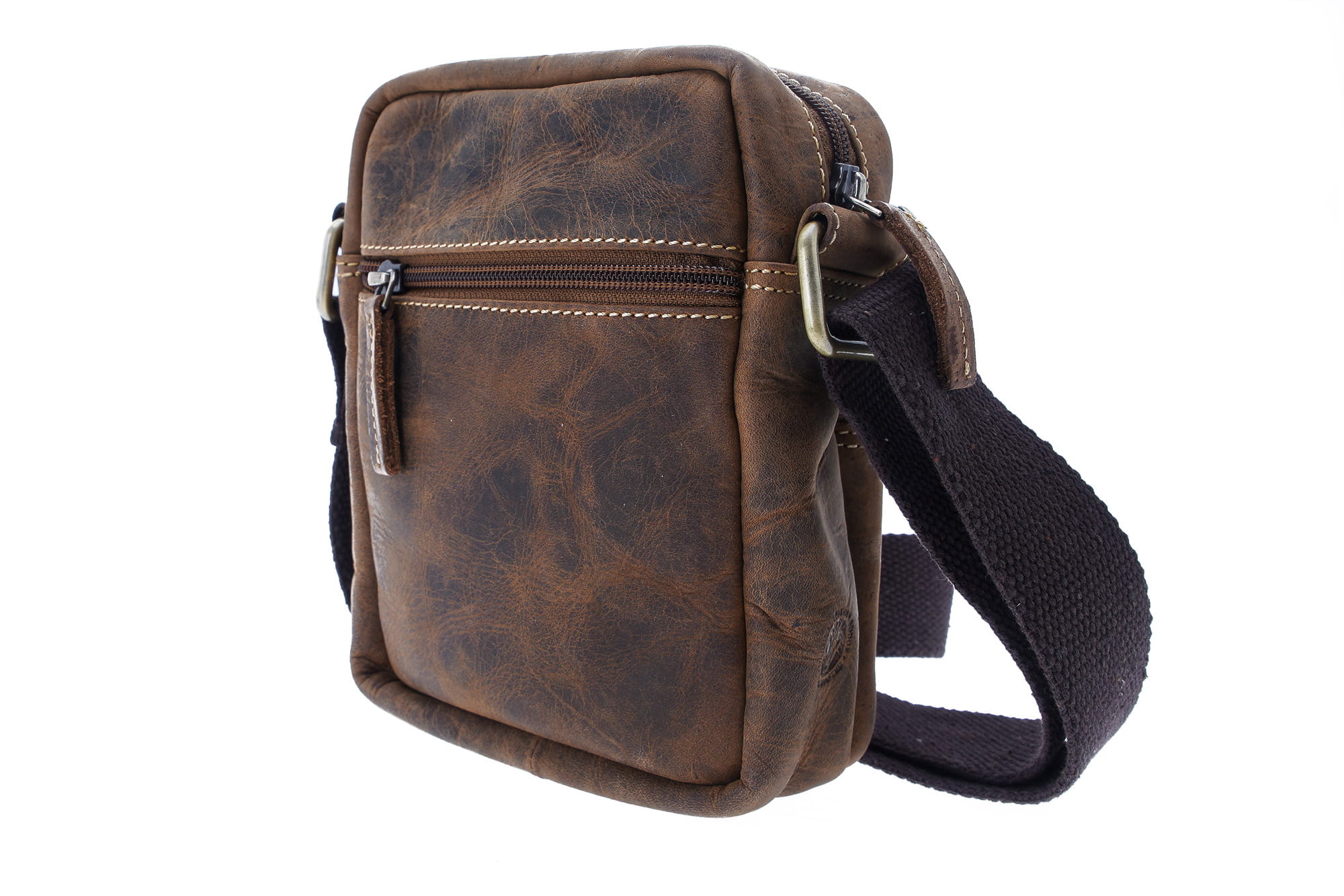 Mała torebka, saszetka podróżna na ramię, zamykana na suwak, uszyta z wysokiej jakości skóry naturalnej, obrabianej ręcznie , naturalnymi garbnikami, co nadaje jej niepowtarzalny wygląd i fakturę w odcieniu klasycznego „postarzanego” brązu.